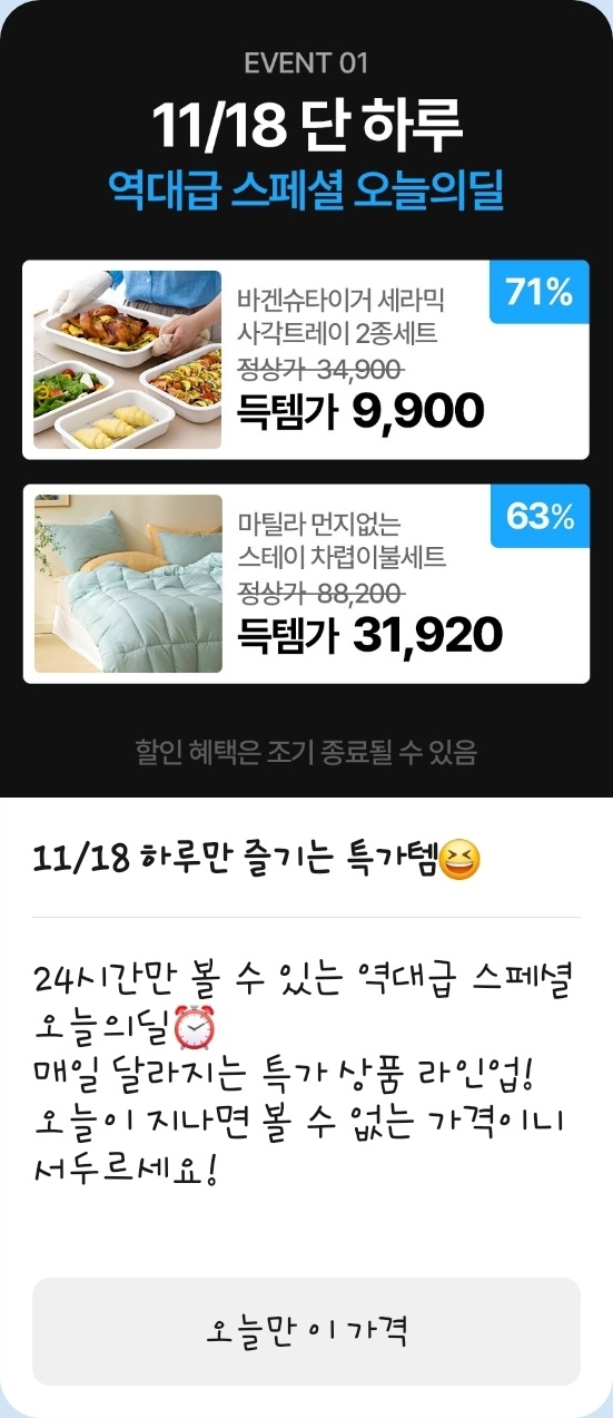 - 매일 인기 상품을 선별해 24시간 한정 초특가에 판매.