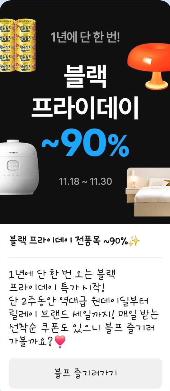 이번 블랙 프라이데이 세일은 가구부터 가전, 생필품까지 모든 카테고리를 아우르는 대규모 행사입니다.
