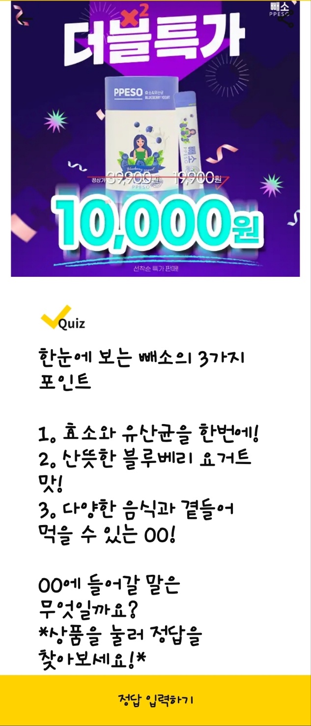 문제: 효소와 유산균을 한번에! 산뜻한 블루베리 요거트 맛! 다양한 음식과 곁들여 먹을 수 있는 OO에 들어갈 말은?