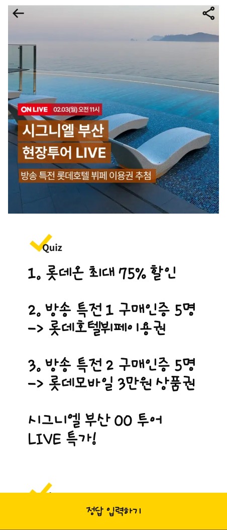 문제: 롯데온 최대 75% 할인! 방송 특전으로 구매 인증을 한 5명에게 롯데호텔 뷔페 이용권을, 또 다른 5명에게 롯데모바일 3만 원 상품권을 증정합니다. 시그니엘 부산 OO 투어 LIVE 특가! OO에 들어갈 단어는 무엇일까요?