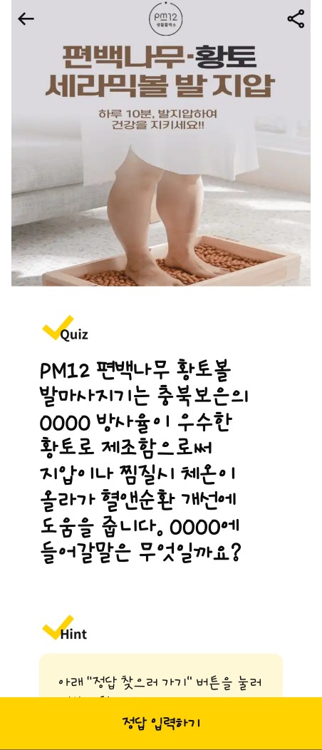 문제: PM12 편백나무 황토볼 발마사지기는 충북 보은의 OOOO 방사율이 우수한 황토로 제작되어, 지압과 찜질 시 체온을 높여 혈액순환을 돕습니다. OOOO에 들어갈 단어는 무엇일까요?