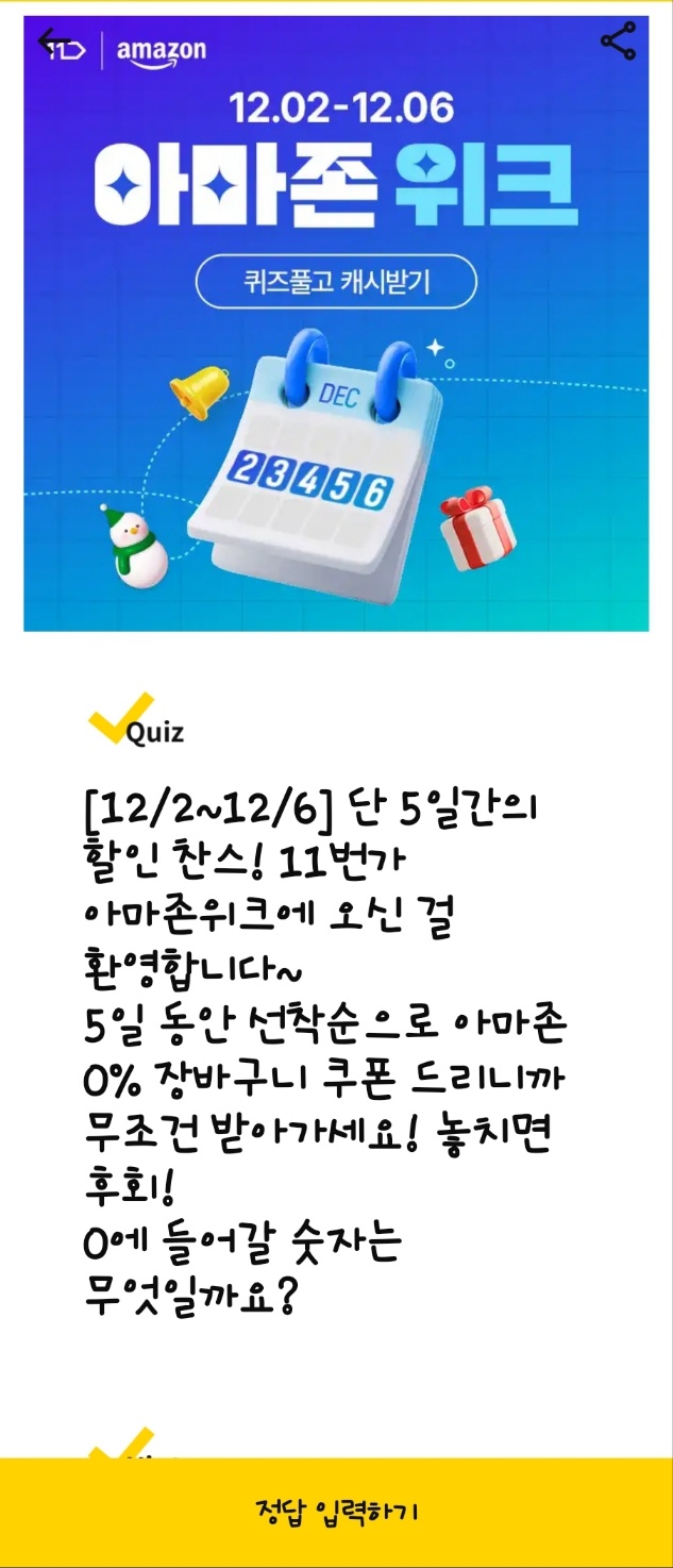 - 문제: 11번가 아마존위크에서 5일 동안 선착순으로 아마존 O% 장바구니 쿠폰을 제공합니다! O에 들어갈 숫자는?