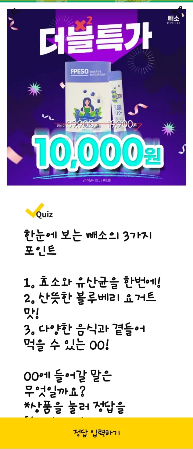 - 문제: 빼소는 효소와 유산균을 한 번에, 산뜻한 블루베리 요거트 맛, 다양한 음식과 곁들여 먹을 수 있는 OO! OO에 들어갈 말은?