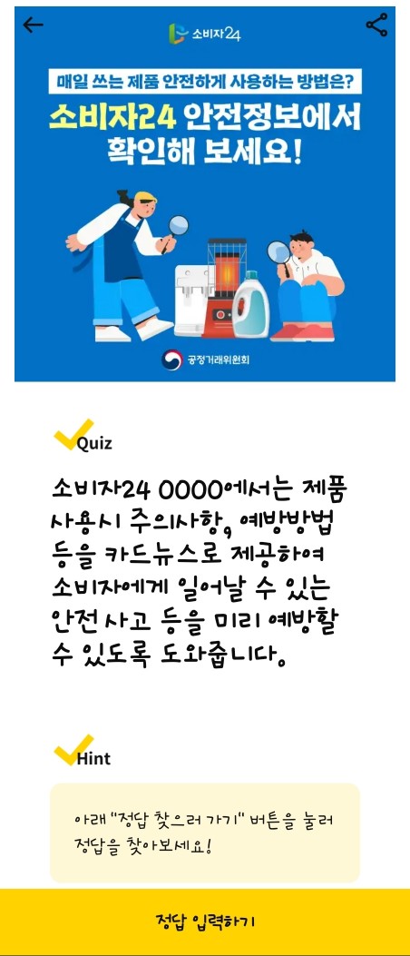 - 문제: "소비자24 OOOO에서는 제품 사용 시 주의사항, 예방방법 등을 카드뉴스로 제공하여 소비자에게 일어날 수 있는 안전 사고 등을 미리 예방할 수 있도록 도와줍니다."
