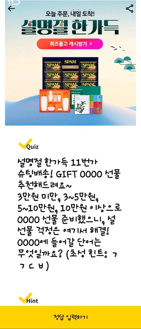 5만원, 510만원, 10만원 이상으로 OOOO 선물 준비했으니, 설 선물 걱정은 여기서 해결!" (초성힌트: ㄱㄱㄷㅂ) - 정답: 가격대별