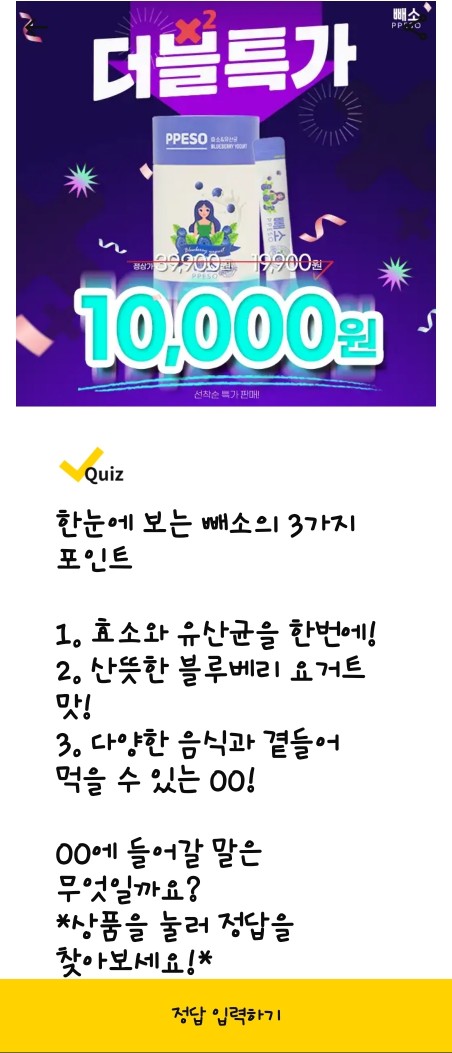 - 문제: "한눈에 보는 빼소의 3가지 포인트! 1. 효소와 유산균을 한번에! 2. 산뜻한 블루베리 요거트 맛! 3. 다양한 음식과 곁들어 먹을 수 있는 OO!"