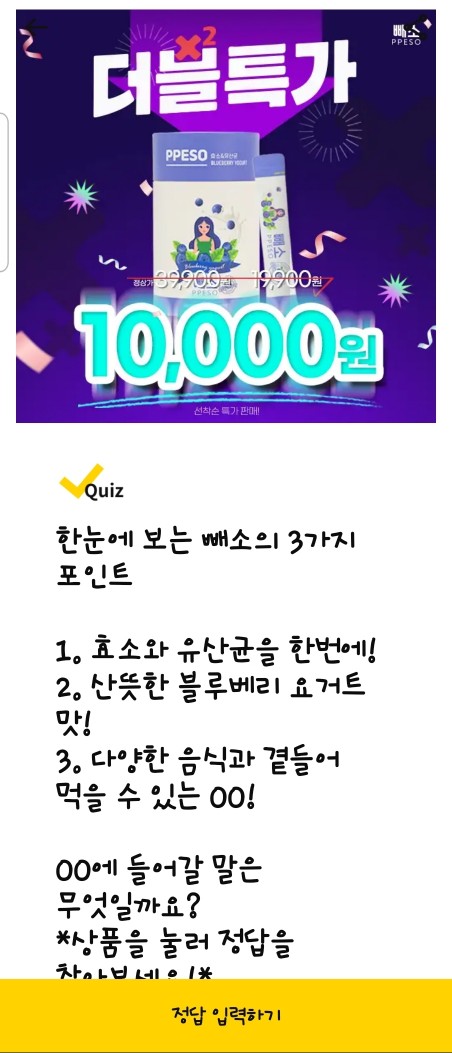 - 문제: 한눈에 보는 빼소의 3가지 포인트 “효소와 유산균을 한번에! 산뜻한 블루베리 요거트 맛! 다양한 음식과 곁들어 먹을 수 있는 OO!”