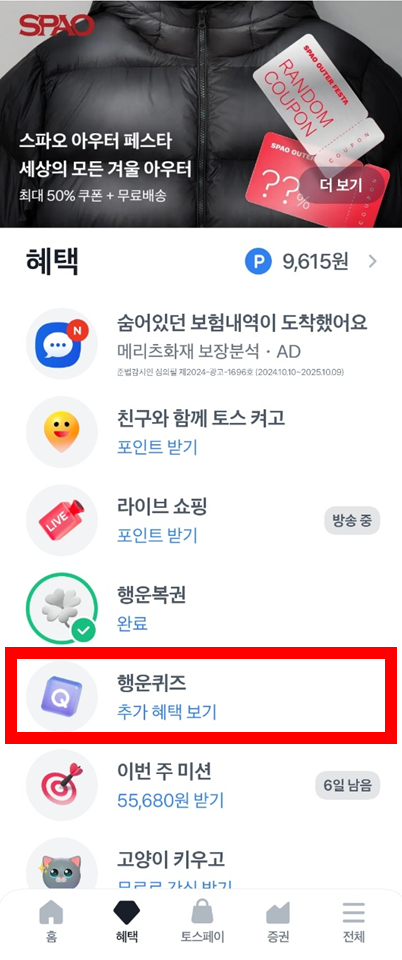- ‘혜택’ 메뉴에서 ‘행운퀴즈’ 선택
