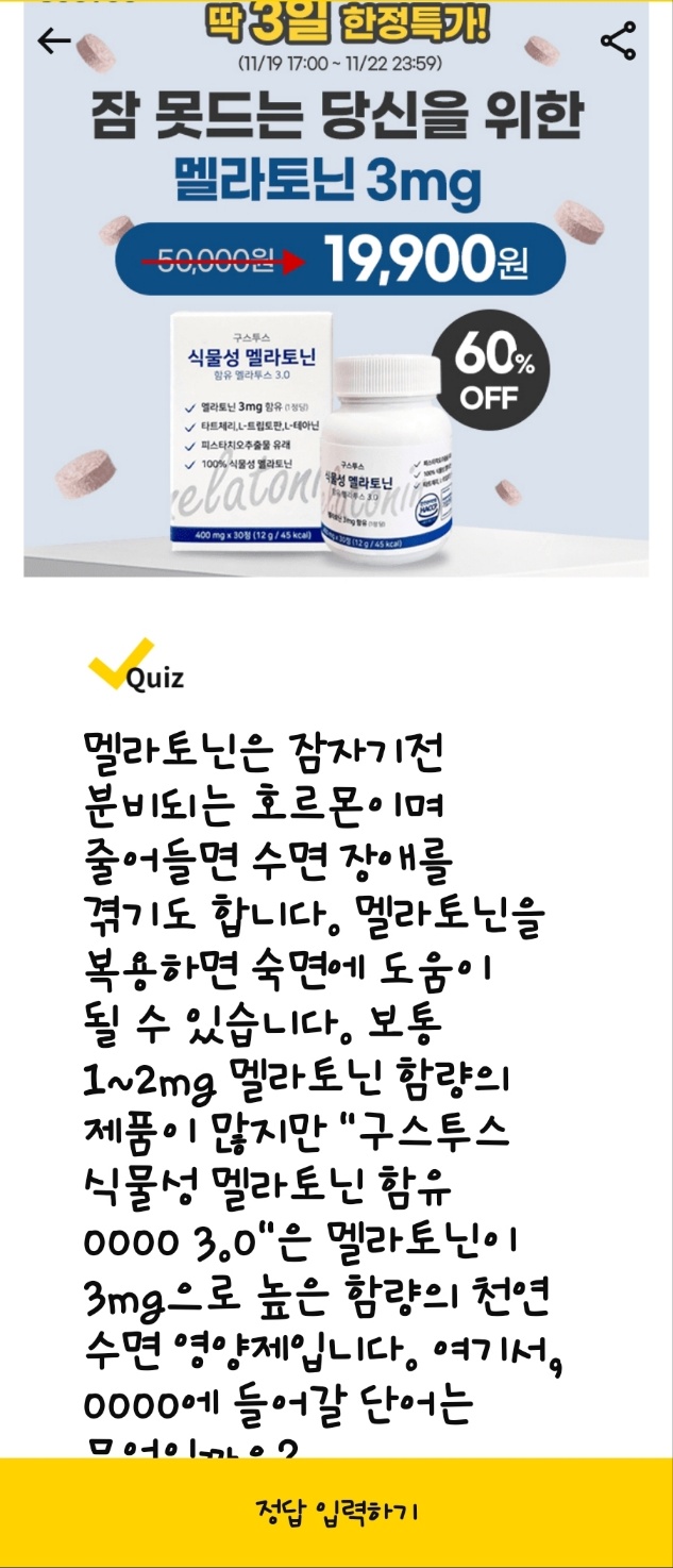 - 문제: "구스투스 식물성 멜라토닌 함유 0000 3.0"은 3mg의 멜라토닌이 함유된 천연 수면 영양제입니다. 0000에 들어갈 단어는 무엇일까요?