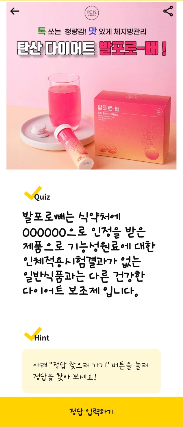 문제: 발포로빼는 식약처에 OOOOOO으로 인정을 받은 제품으로 건강한 다이어트 보조제입니다. OOOOOO에 들어갈 단어는 무엇일까요?