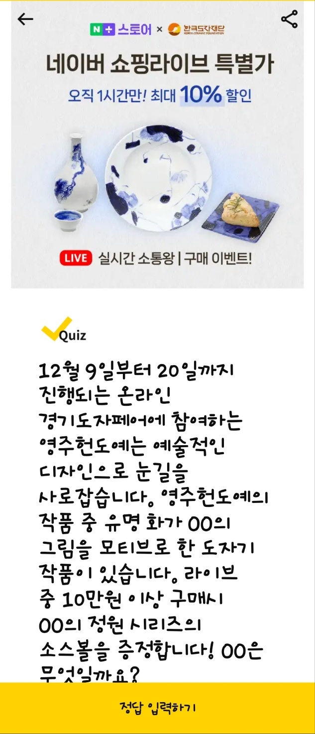 - 문제: 온라인 경기도자페어에 참여 중인 영주헌도예는 유명 화가 OO의 그림을 모티브로 한 도자기 작품을 선보입니다. OO은 누구일까요?