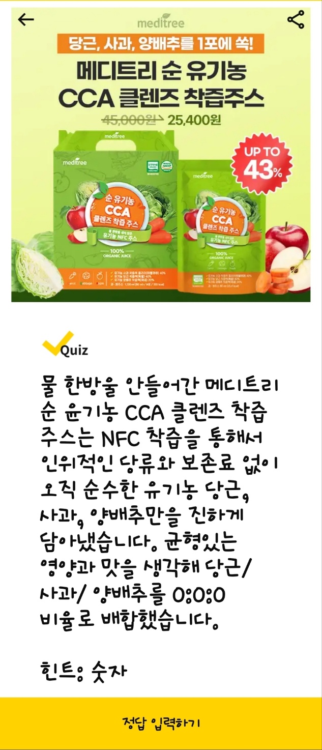 - 문제: 메디트리 순 윤기농 CCA 클렌즈 착즙 주스는 인위적인 당류와 보존료 없이 순수한 유기농 OOO 당근으로 만들어졌습니다. OOO에 들어갈 단어는? (힌트: ㄷㅇㅅ)