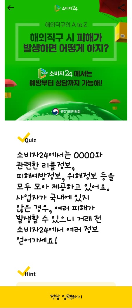 - 문제: 소비자24에서는 OOOO와 관련한 리콜정보, 피해예방정보, 위해정보 등을 제공하고 있습니다. OOOO에 들어갈 말은?