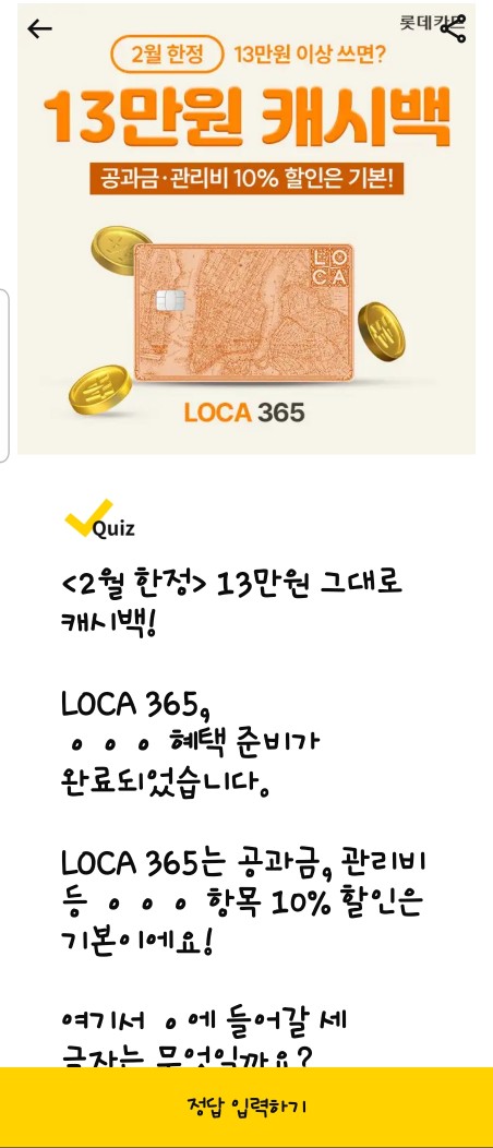 문제: <2월 한정> 13만원 그대로 캐시백! LOCA 365, ㅇㅇㅇ 혜택 준비가 완료되었습니다. LOCA 365는 공과금, 관리비 등 ㅇㅇㅇ 항목 10% 할인은 기본이에요! 여기서 ㅇㅇㅇ에 들어갈 세 글자는?