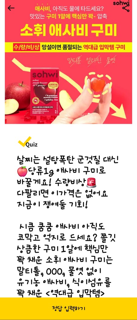 문제: 쫄깃 상큼한 구미 1알에 핵심만 꽉 채운 소휘 애사비 구미는 OOO, 젤라틴, 물엿 없이 유기농 애사비, 식이섬유를 꽉 채운 <역대급 입막템> 비건인증 구미입니다. 여기서 OOO은?