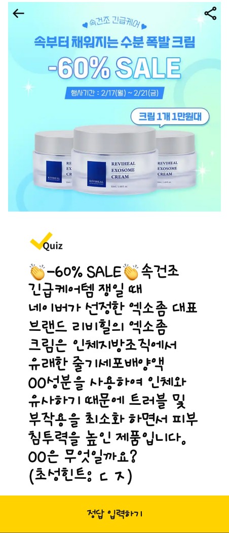 문제: 네이버가 선정한 엑소좀 대표 브랜드 리비힐의 엑소좀 크림은 인체지방조직에서 유래한 줄기세포배양액 OO성분을 사용하여 피부 침투력을 높인 제품입니다. OO은 무엇일까요? (초성힌트: ㄷㅈ)