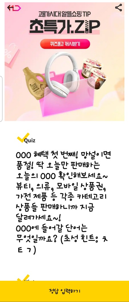 문제: 유통기한 임박 상품 할인 찬스! OOOO 찬스를 놓치지 마세요! (초성 힌트: ㅇㅂㅁㅋ) 정답: 임박마켓 다른 정답: 초특가, 체험딜, 창고대개방