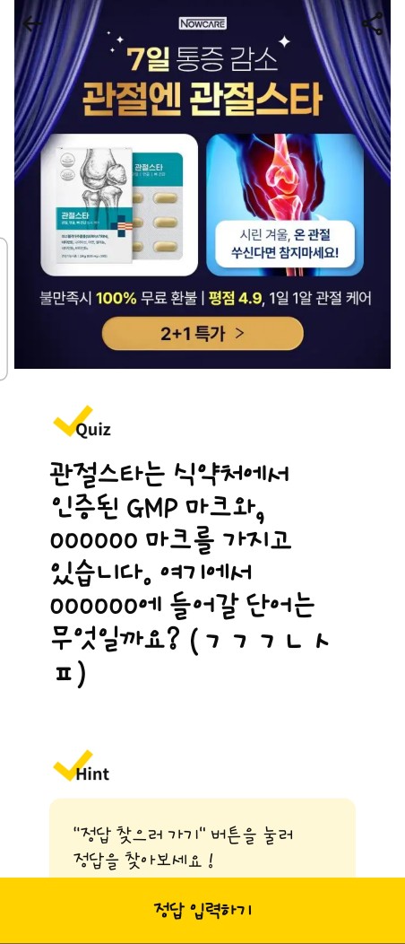 문제: 관절스타는 제품 불만족 시 100% 환불을 진행하는 반품안심케어 정책을 운영 중입니다. 제품 수령 후 000일 이내 환불 신청이 가능한데, 여기서 000에 들어갈 숫자는? 정답: 100 다른 정답: 250, 관절연골뼈, 건강기능식품