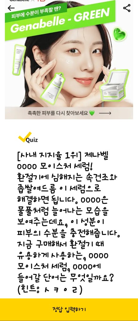 문제: 제나벨 0000 모이스처 세럼! 물풀처럼 늘어나는 이 성분이 피부 수분 충전에 도움을 줍니다. (힌트: ㅅㅋㅇㄹ) 정답: 스쿠알란