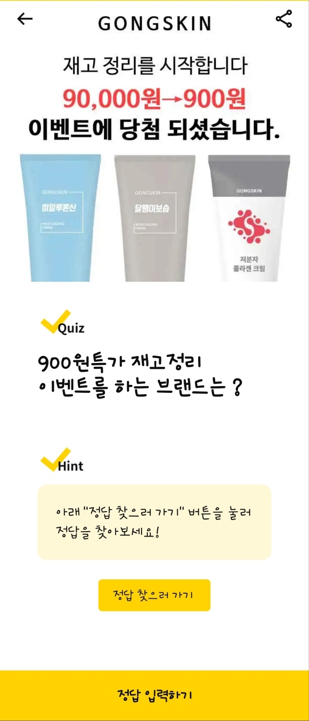 문제: 900원 특가 재고 정리 이벤트를 진행하는 브랜드는? 정답: 공스킨