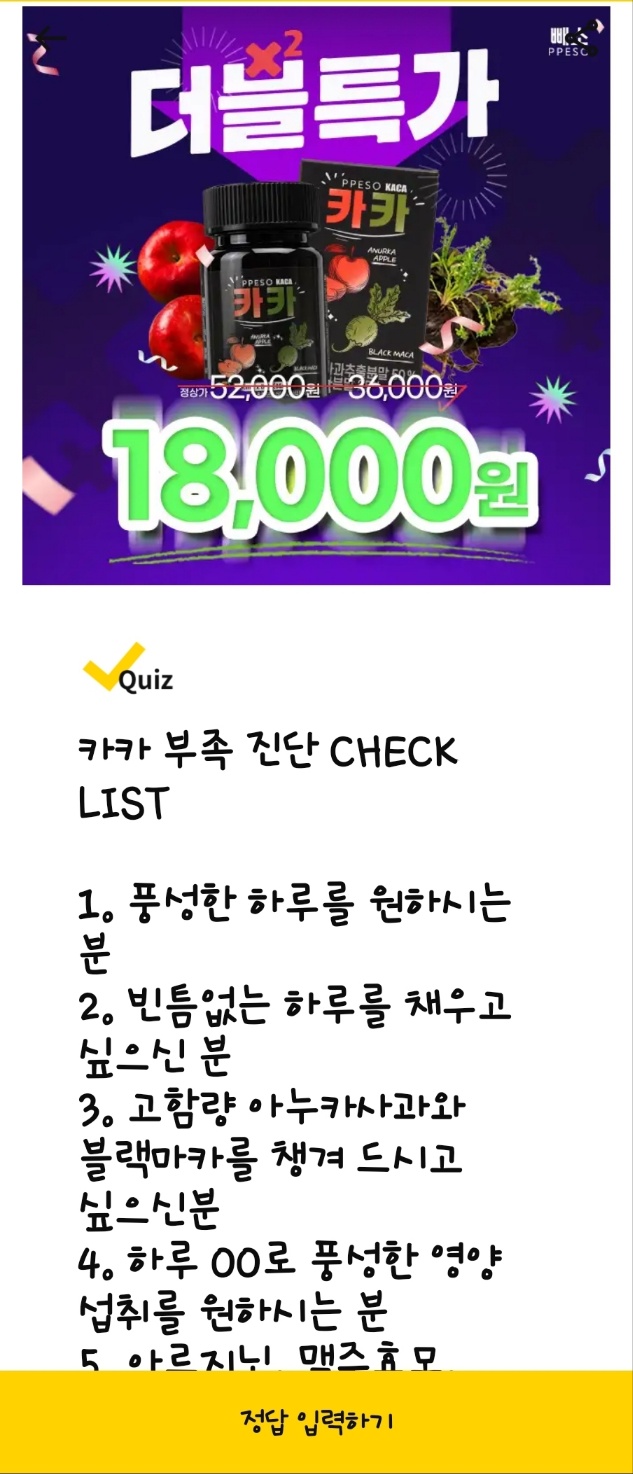문제: 하루 OO로 풍성한 영양 섭취를 원하시는 분을 위한 빼소 제품. OO에 들어갈 단어는? 정답: 한알