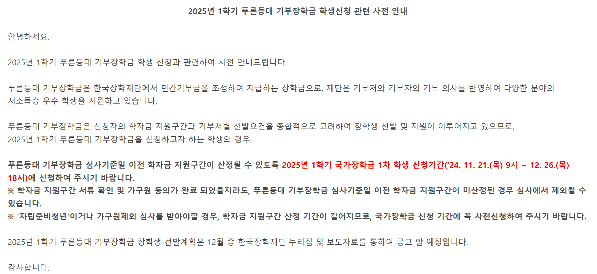 - 공고 이후 신청 필수: 푸른등대 기부장학금은 선발 기준 및 세부 사항이 공고된 이후에 신청해야 하므로 일정에 유의하세요.