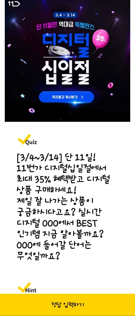 문제: 단 11일간 누리는 특별한 혜택! 11번가 OOO십일절에 오신 걸 환영합니다~ 지금 ~15% 즉시할인 쿠폰 드리니까 신학기 준비는 OOO십일절에서 지금 해결! OOO에 들어갈 단어는 무엇일까요?