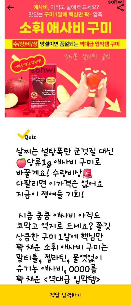 문제: 소휘 애사비구미는 OOO, 젤라틴, 물엿 없이 유기농 애사비, 식이섬유를 꽉 채운 <역대급 입막템> 비건인증 구미 입니다. 여기서 OOO은?