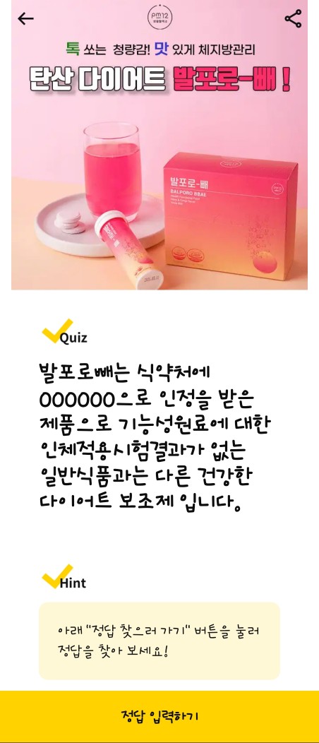 문제: PM12 발포로빼는 식약처에 OOOOOO으로 인정을 받은 건강한 다이어트 보조제입니다.